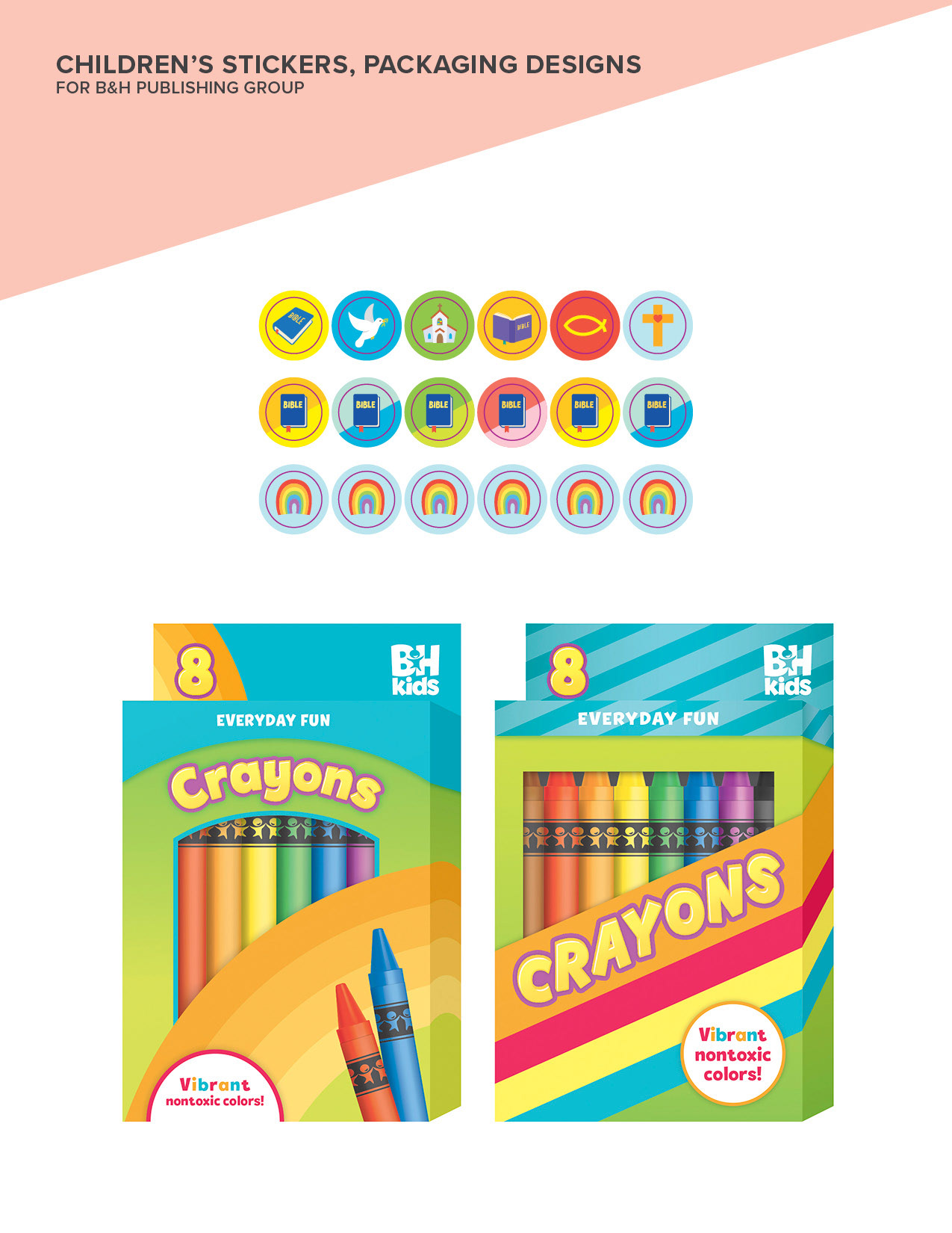 Reward sticker designs and concept development for crayon packaging. Designed for B&H Publishing Group.